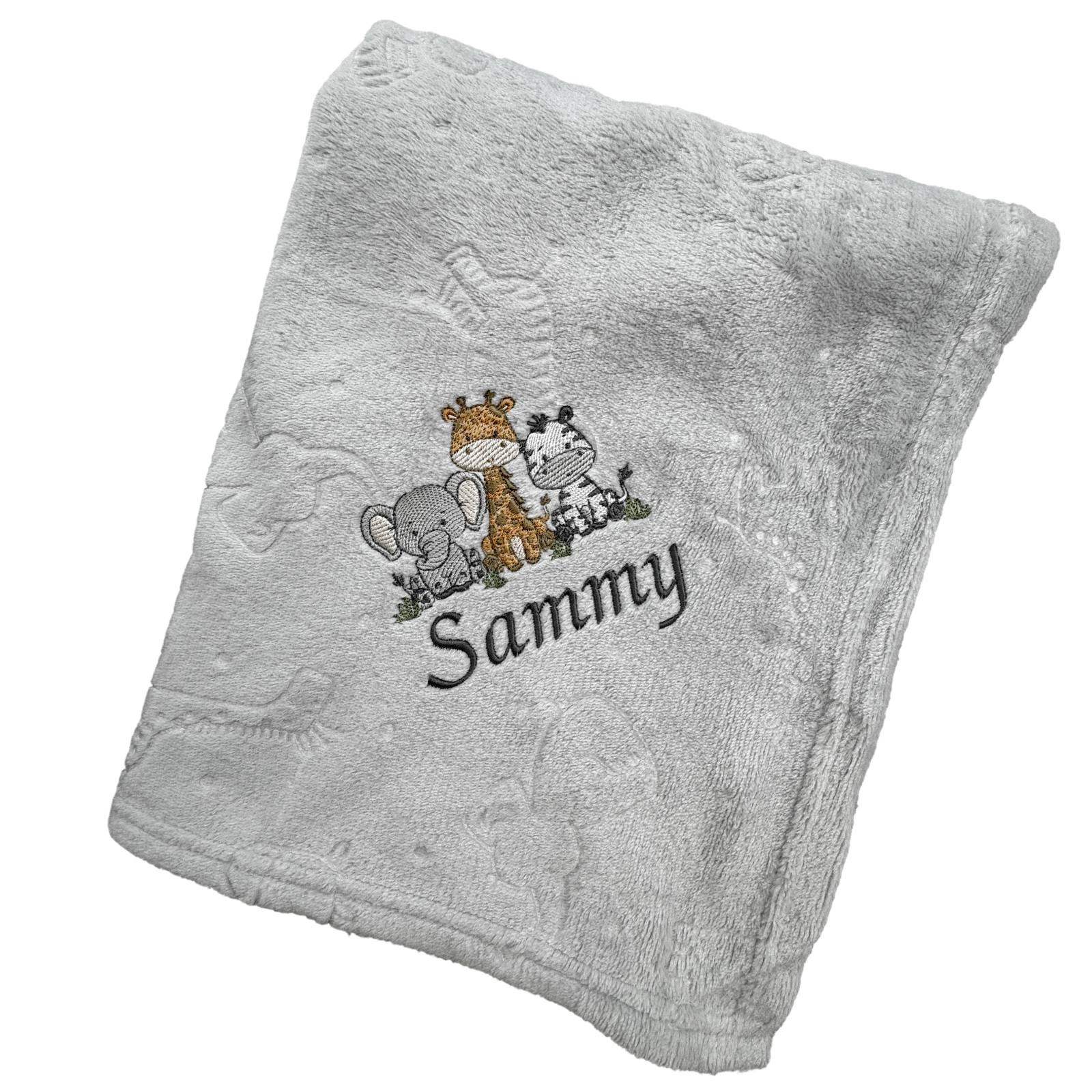 Baby Blanket with Embroidered Safari Motif 90cm x 75cm Personalised with Baby