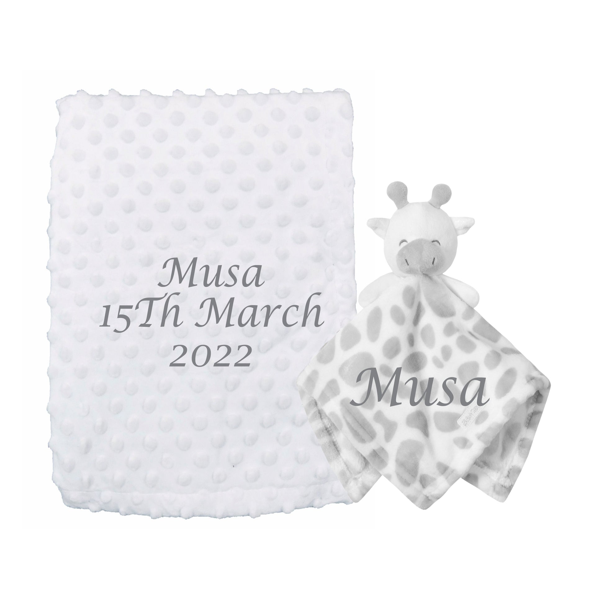 Giraffe Comforter Matching Blanket BOTH ITEMS PERSONALISED with embroidery Beautiful Keepsake Baby Gift