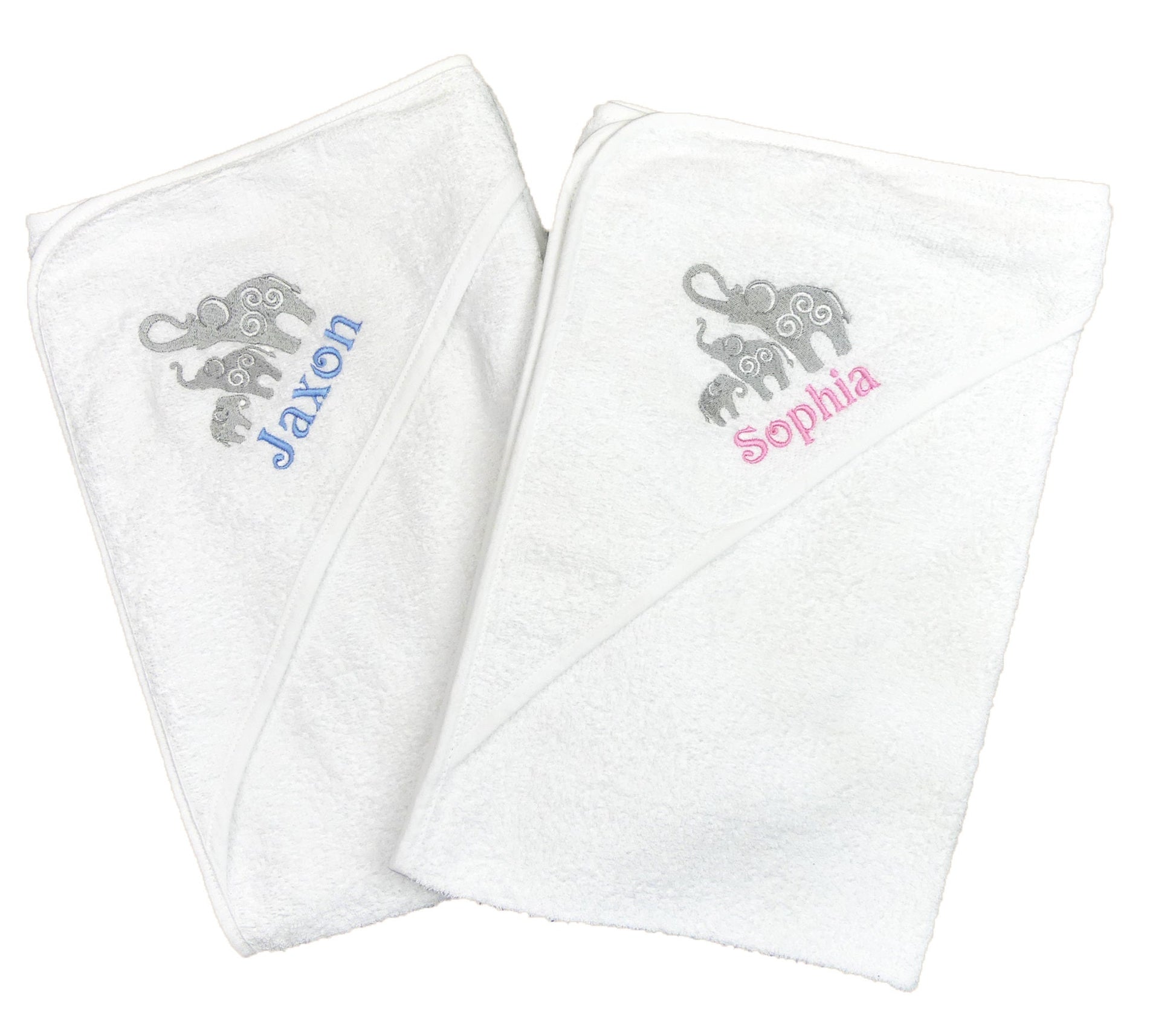 This is our newest design in our great range of baby hooded towels. It features a family of elephant embroidered in a sleek grey thread. We can add the name in the same grey to match or in pink or blue. (we have most colours if you want something different- just ask)