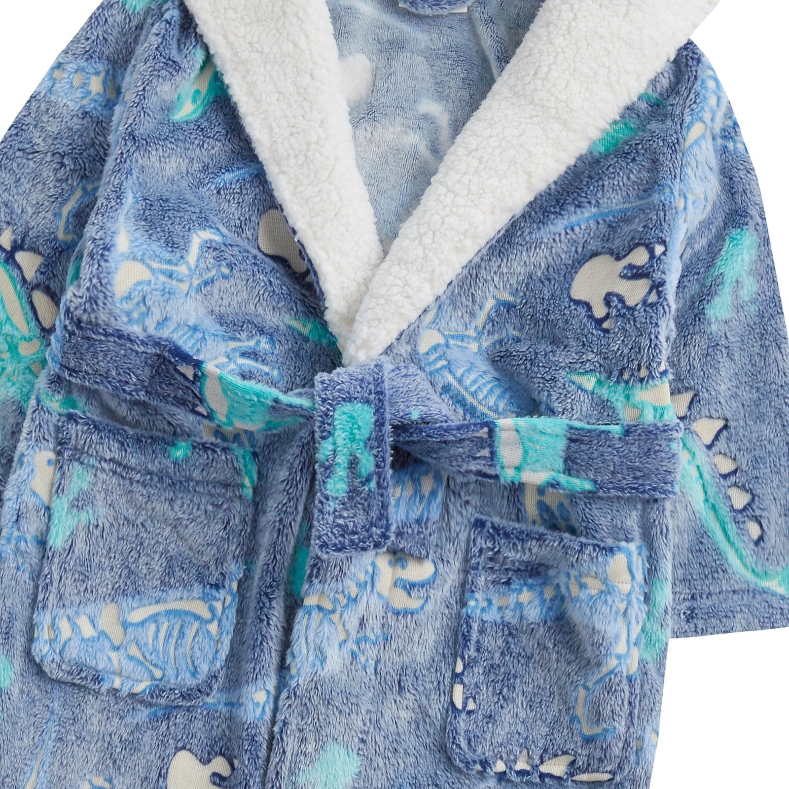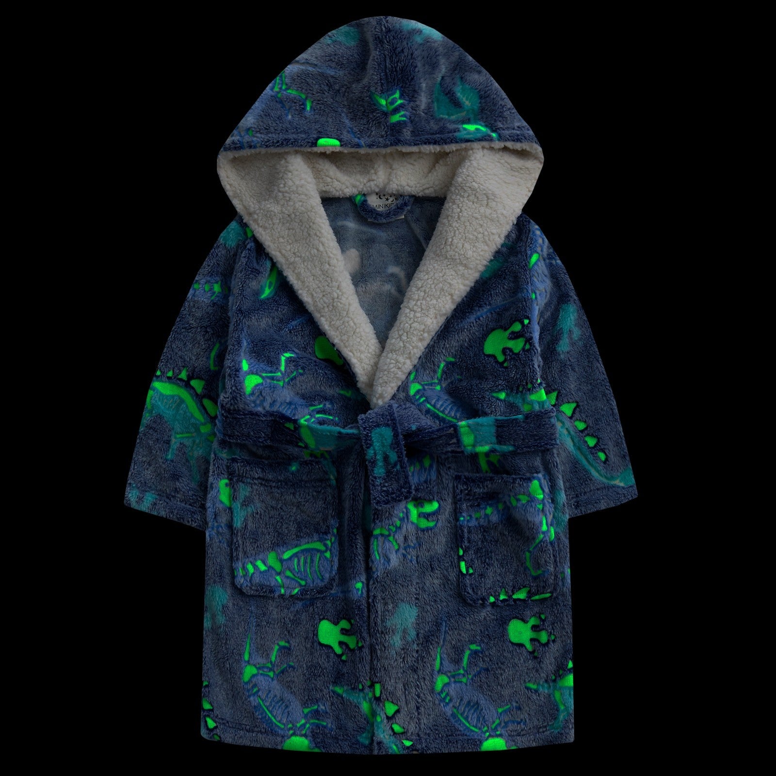 Make bedtime and cosy mornings extra fun with this glow-in-the-dark dinosaur dressing gown for kids. Featuring a playful fossil dinosaur print that comes to life when the lights go out, this soft fleece robe is perfect for little dino fans.