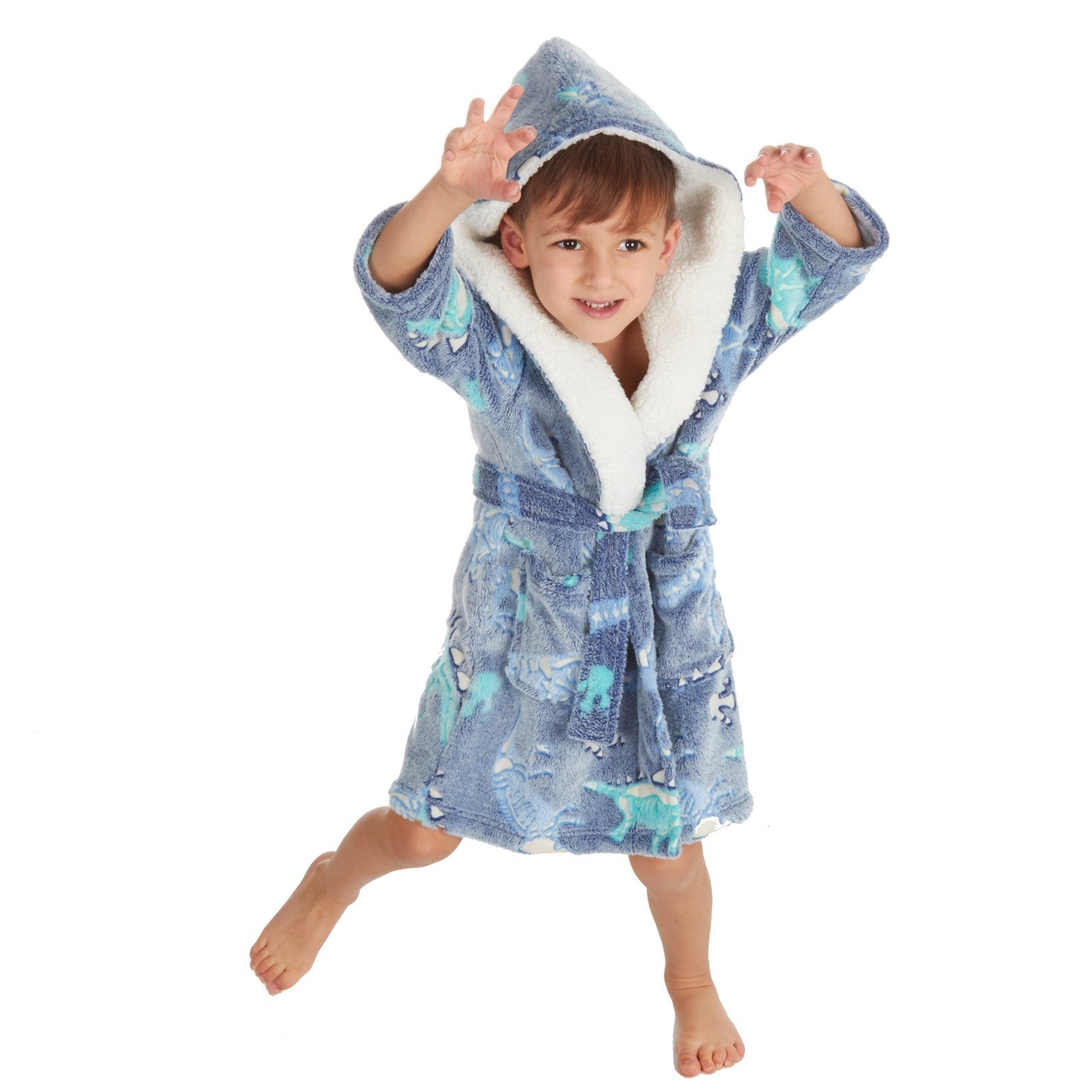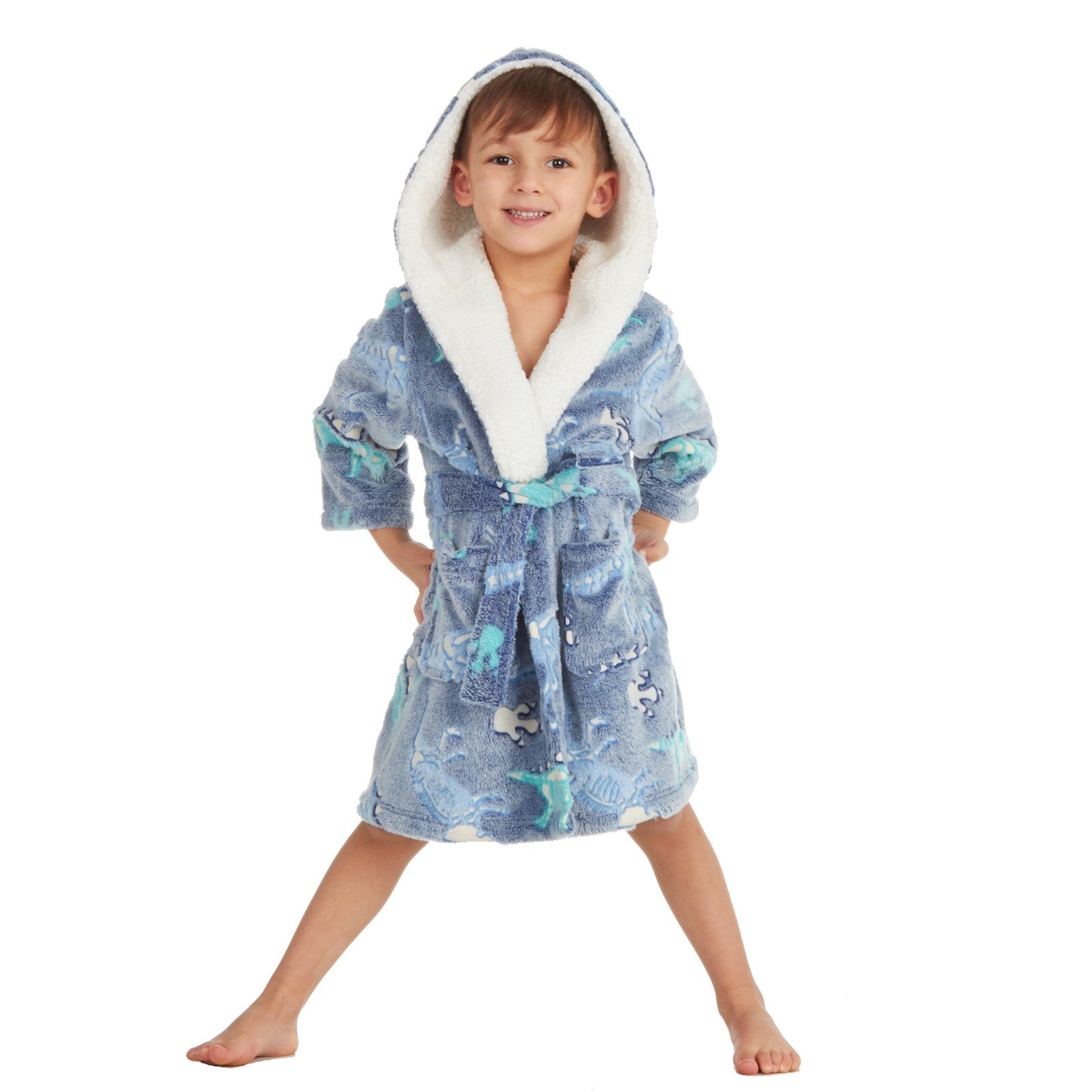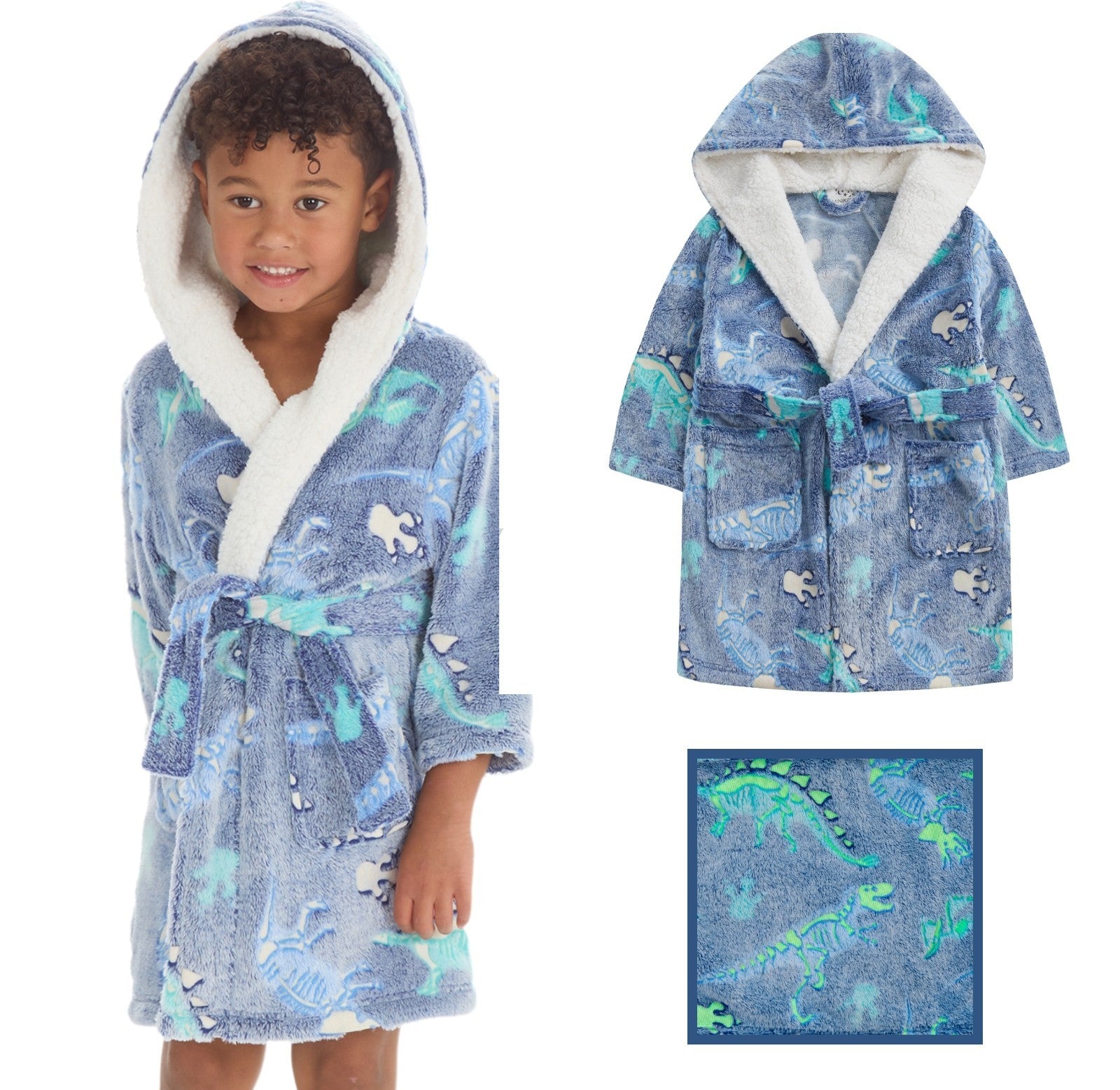 Kids Hooded Glow in the Dark Dinosaur Dressing Gown – Super Soft Fleece Robe with Belt