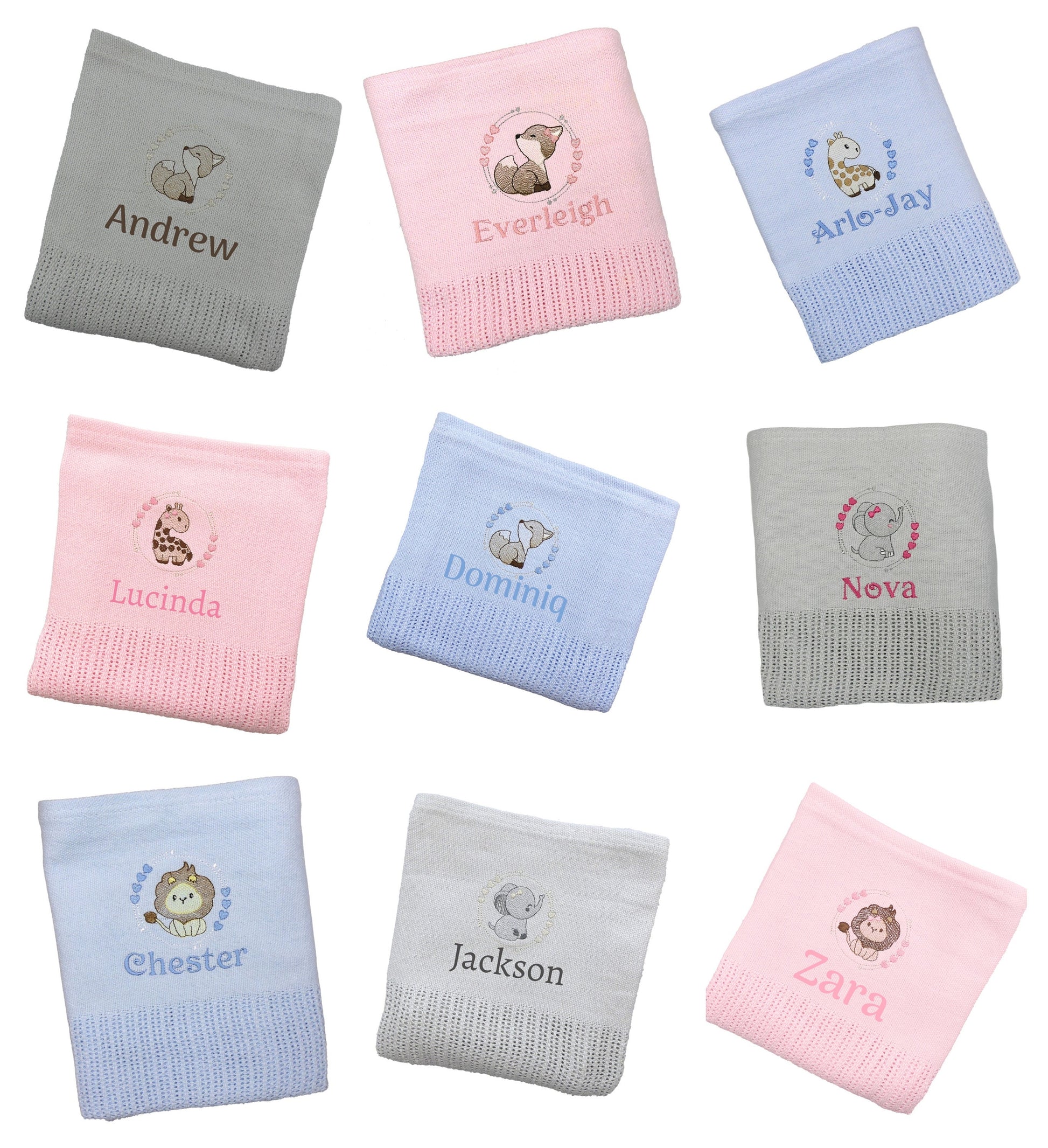 Introducing the perfect gift for the newest addition to your family - a personalised cotton cellular baby blanket with adorable animal embroidery!