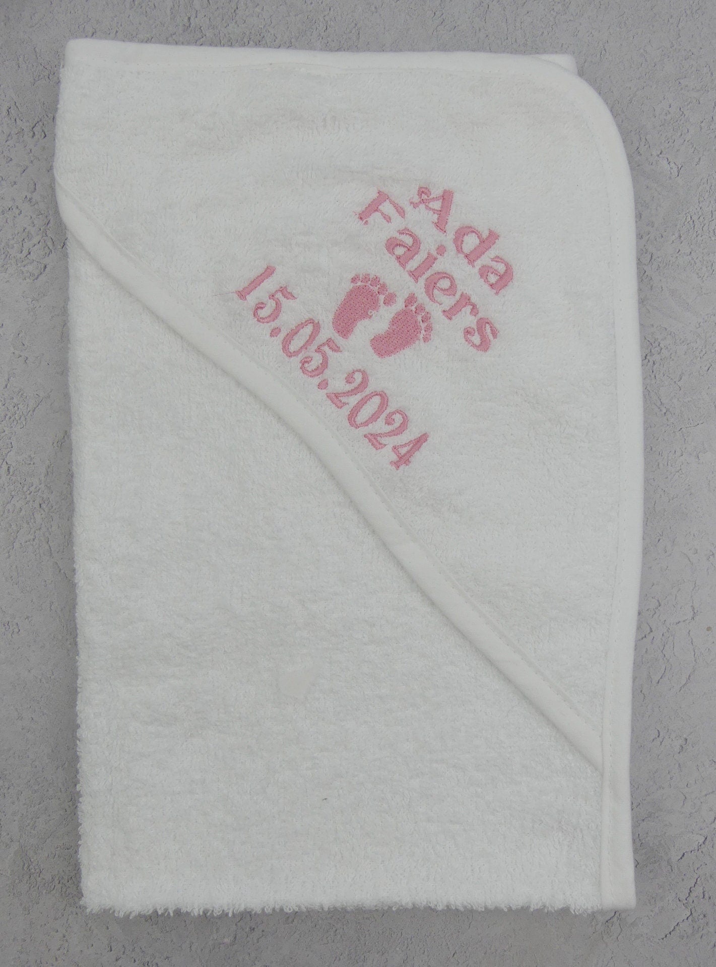 Personalized to create a keepsake, each towel is embroidered with your baby‘s name, date of birth, and a pair of adorable newborn feet. Choose from a variety of embroidery colors to make it uniquely yours. Whether it‘s bath time or cuddle time, this hooded towel ensures your baby stays warm and cozy.