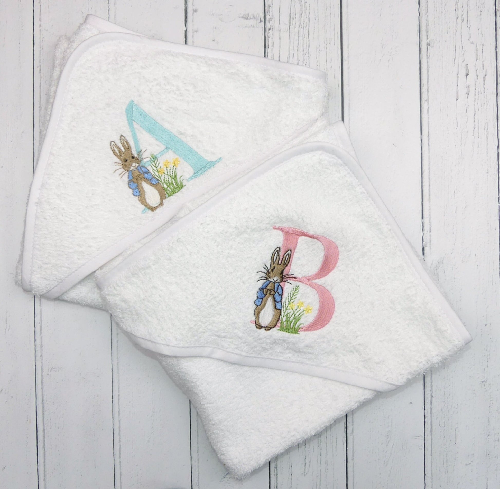 Take a look at our Peter Rabbit monogrammed hooded baby towel, crafted from 100% soft cotton for ultimate comfort. Measuring a generous 75 cm by 70 cm, this baby bath towel offers perfect coverage and cosiness after every bath. The towel is